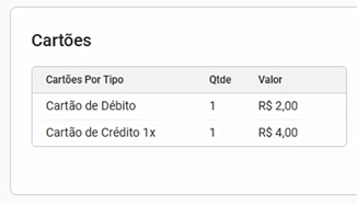 - Cartão por tipo: lista a soma das transações de cartão em Débito/Crédito.