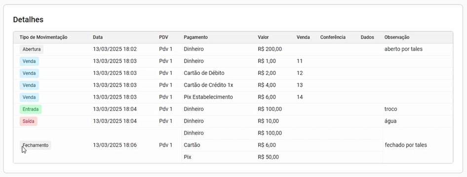 - Detalhes: lista detalhada de todas as ações do caixa: abertura, movimentações, e fechamento.