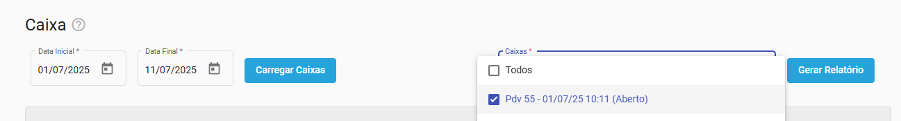 - Selecione o período de datas do dia em que o caixa foi aberto.