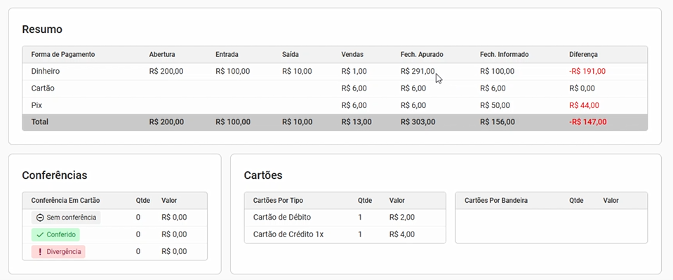 - Vendas - soma o valor recebido de acordo com a forma de pagamento, descontando o troco caso seja em dinheiro.