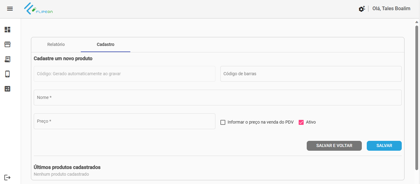 - No menu, pressione em Produto ou acesse diretamente pelo link: https://app.flipeon.com/product