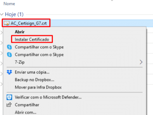 - Pressione com o botão direito do mouse sobre o arquivo do certificado e pressione em Instalar Certificado.