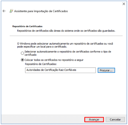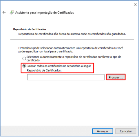 - Marque a opção Colocar todos os Certificados no repositório a seguir, depois pressione em Procurar.