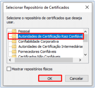 - Selecione a opção Autoridades de Certificação Raiz Confiáveis, depois pressione em OK.