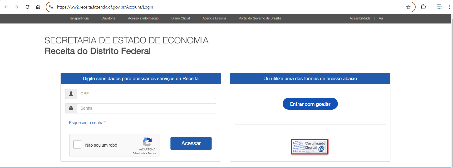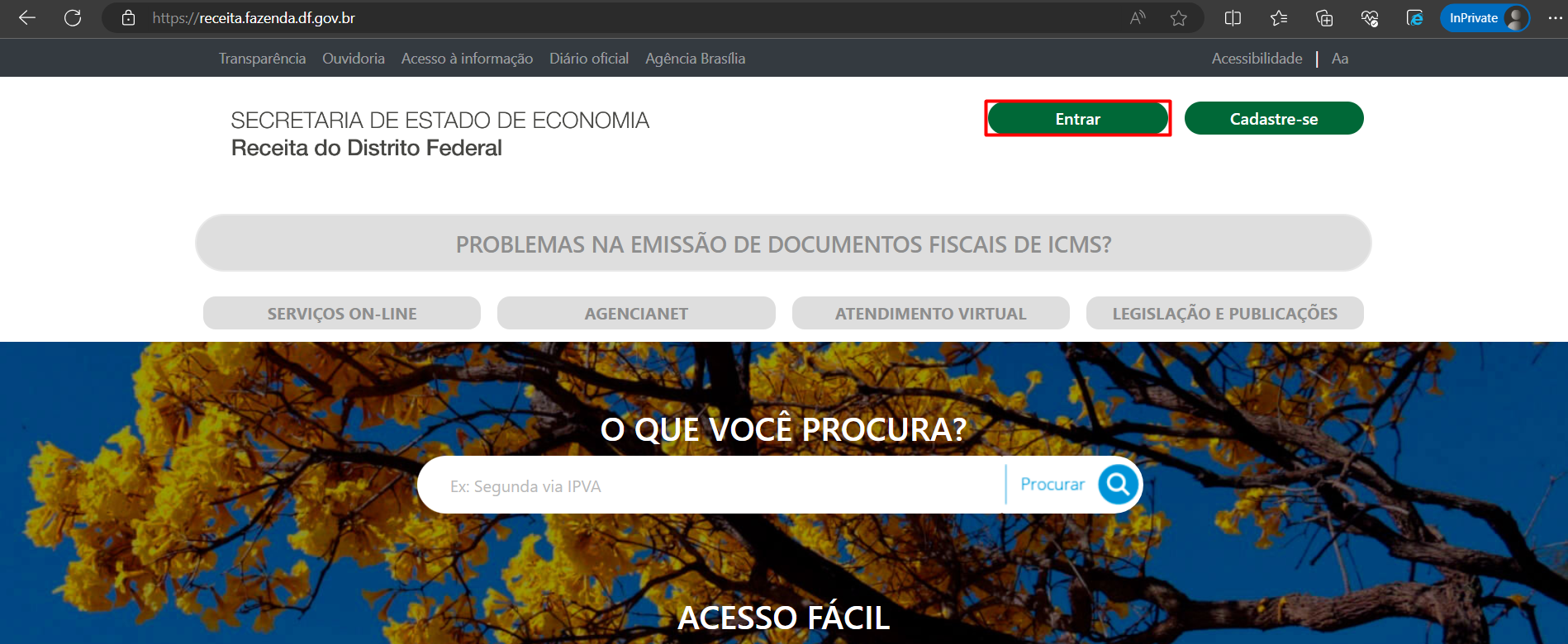 - Acesse o site da SEFAZ do DF pelo link https://ww2.receita.fazenda.df.gov.br e clique em Entrar