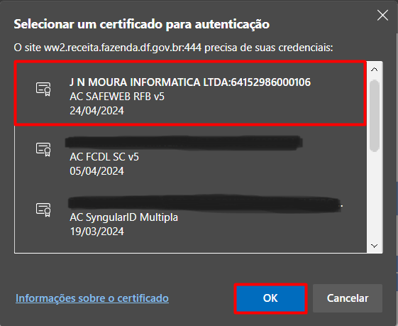- Selecione o certificado digital da sua empresa e pressione Ok.