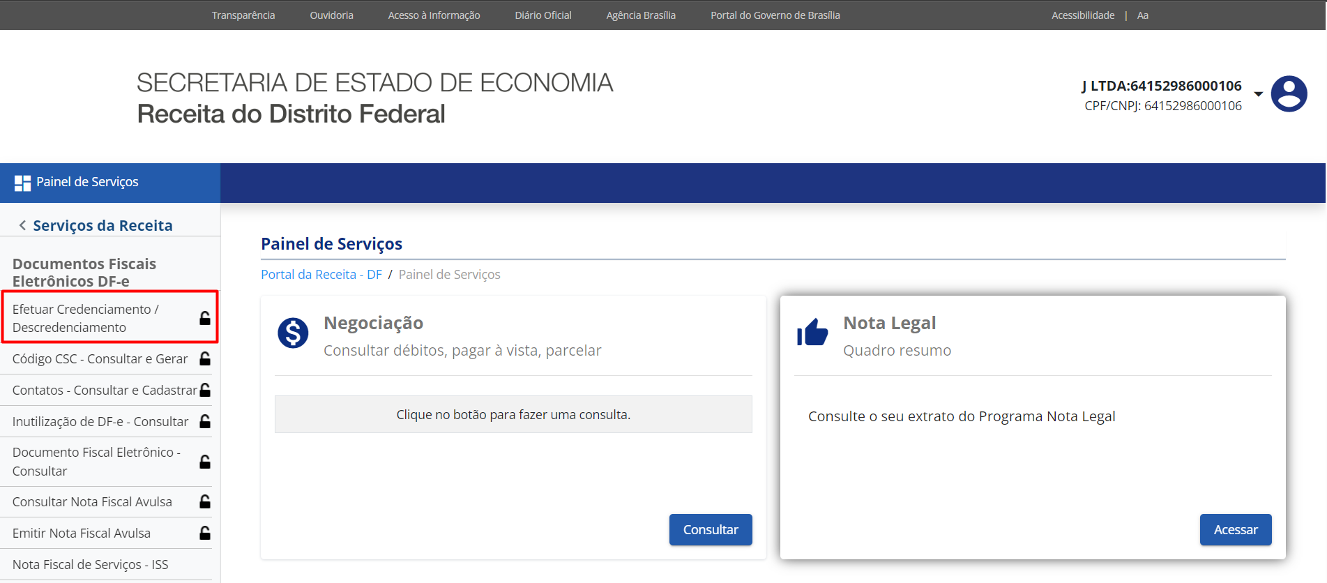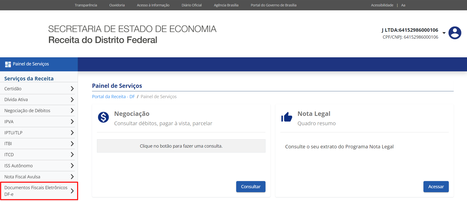 - Em Painel de Serviços selecione a opção Documentos Fiscais Eletrônicos DF-e.