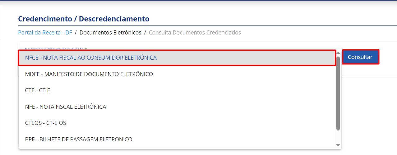 - No combo, selecione no menu a opção NFCE - Nota Fiscal ao Consumidor Eletrônica e clique em Consultar