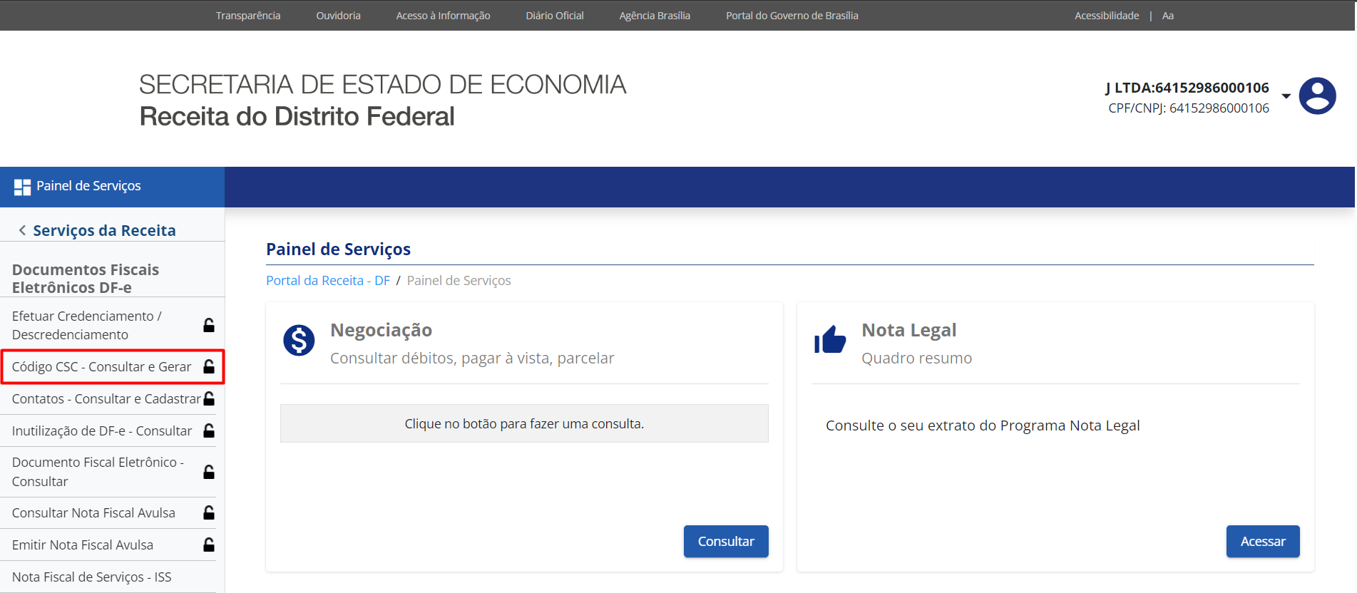 - Para consultar ou gerar o código CSC, em Painel de Seviços selecione a opção Código CSC - Consultar e Gerar