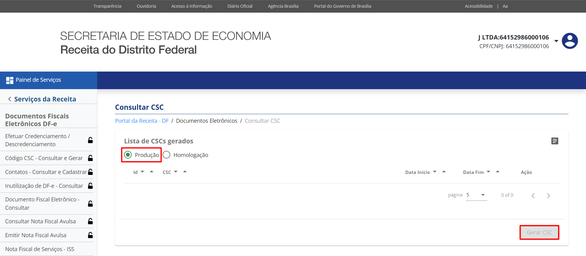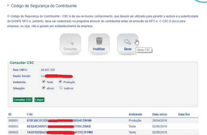 - Selecione a opção Produção e em seguida clique em Gerar para gerar o CSC.