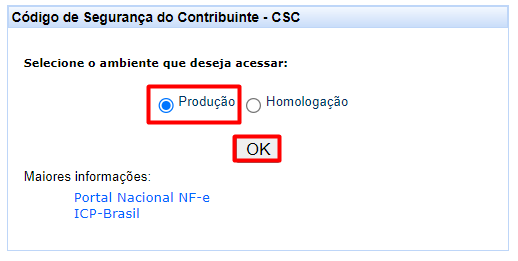 - Na tela que será exibida, selecione a opção desejada (Produção ou Homologação) para gerar o CSC e clique em OK.