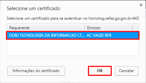- Selecione o Certificado Digital da sua empresa e clique em OK.
