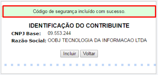 - A página exibirá uma mensagem informando: Código de Segurança incluído com Sucesso
