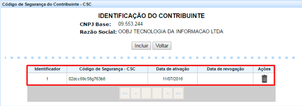 - O código CSC e CSC ID serão exibidos e listados na grade: