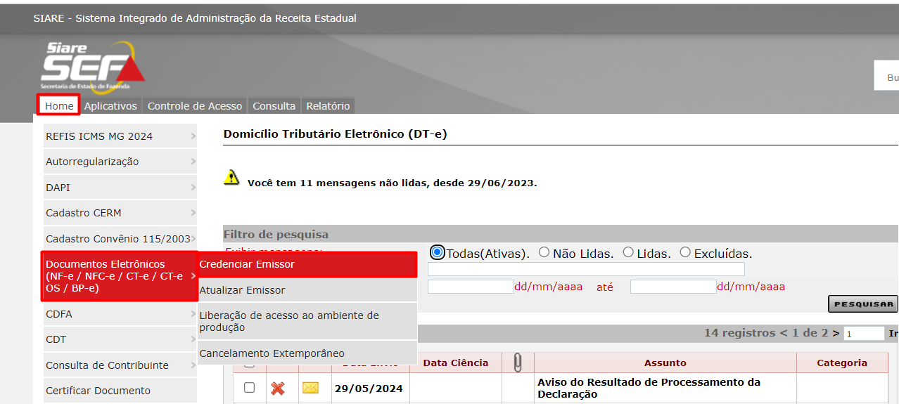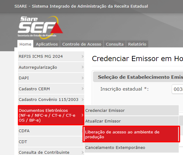 - Em Home, na opção Documentos Eletrônicos, selecione Credenciar Emissor.