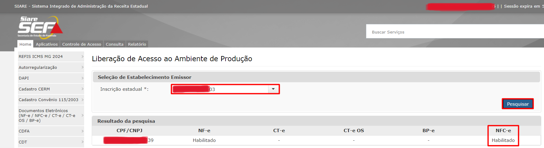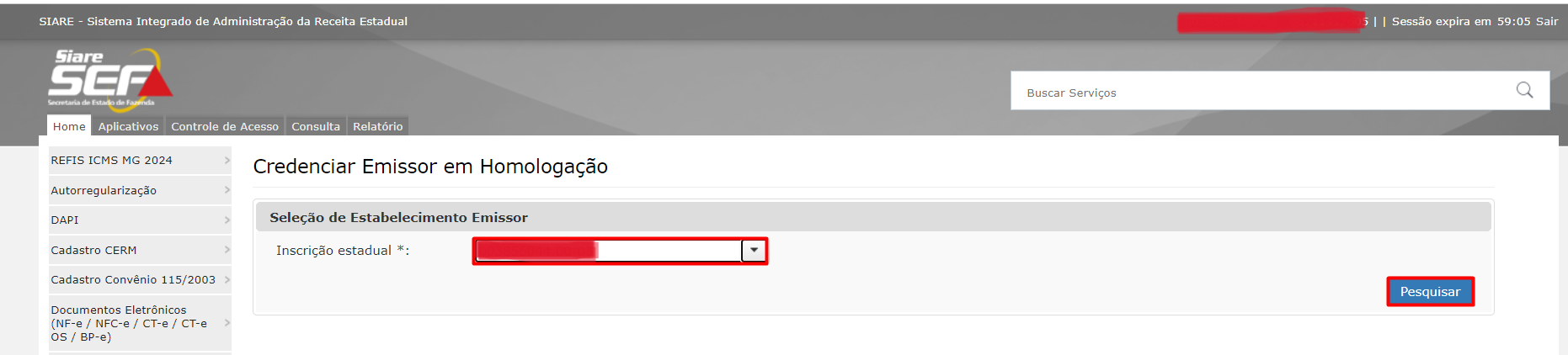 - Selecione sua Inscrição Estadual e clique em Pesquisar
