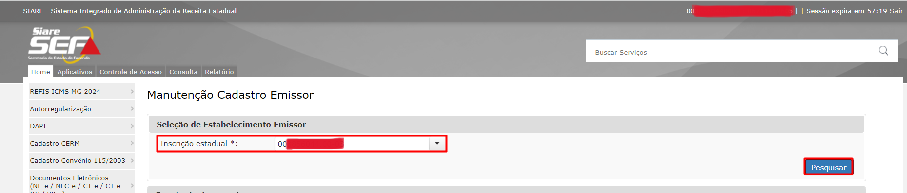 - Selecione a Inscrição Estadual e clique em Pesquisar