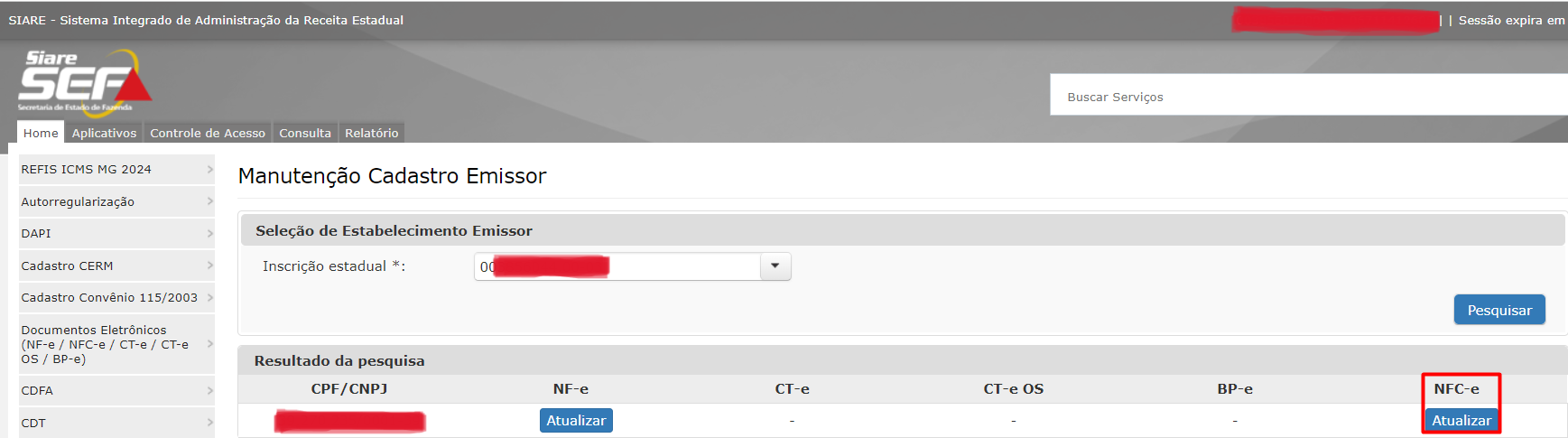 - Na coluna NFC-e clique em Atualizar.