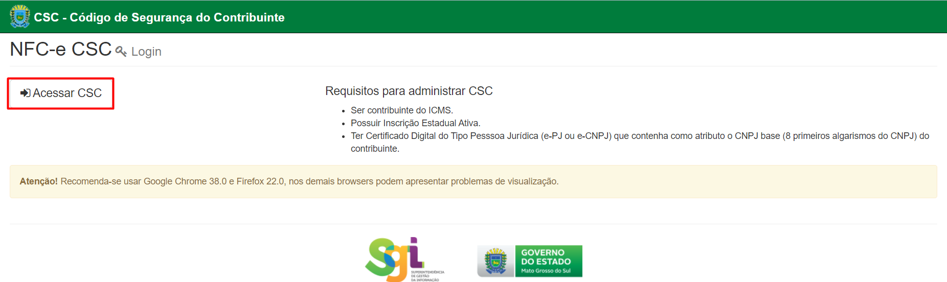 - Acesse a página da Sefaz MS atraves do link: https://www.dfe.ms.gov.br/csc/