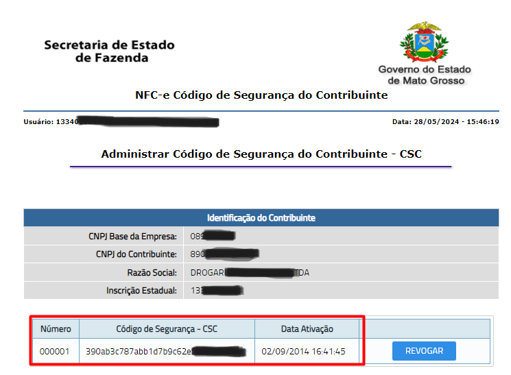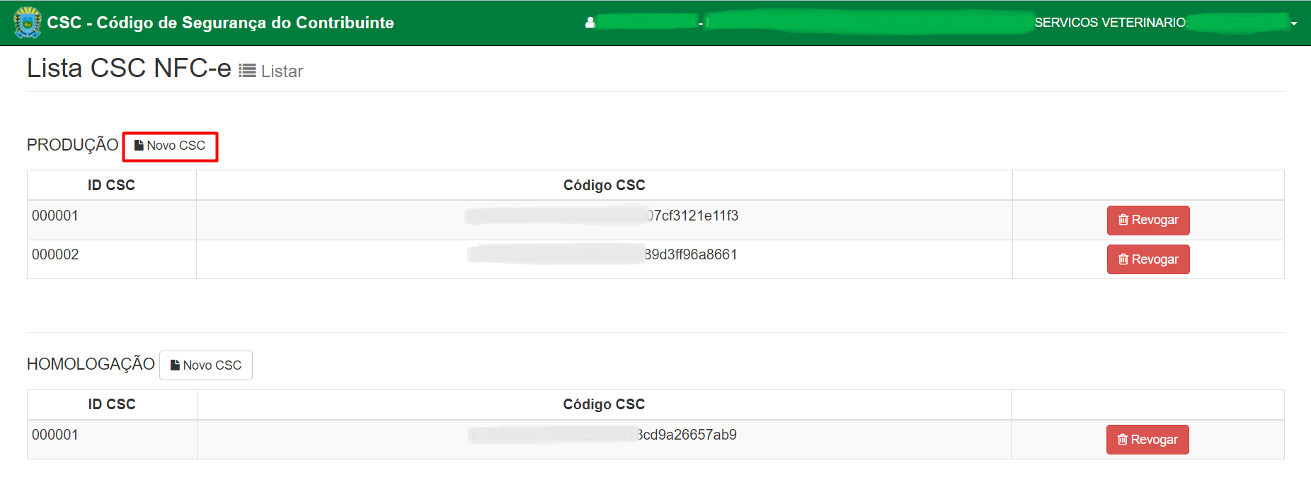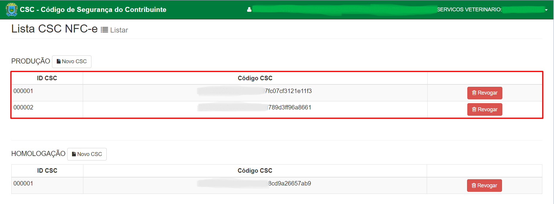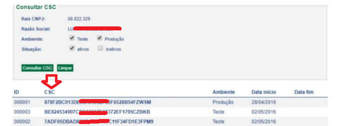 - Na tela aberta, serão exibidos os códigos CSC gerados.