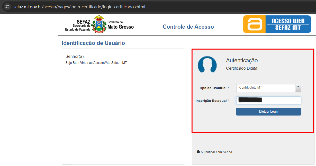 - Em Autenticação selecione a opção Contribuinte MT.