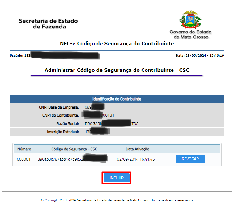 - Serão exibidas as informações da sua empresa. Clique em Incluir para gerar o CSC.