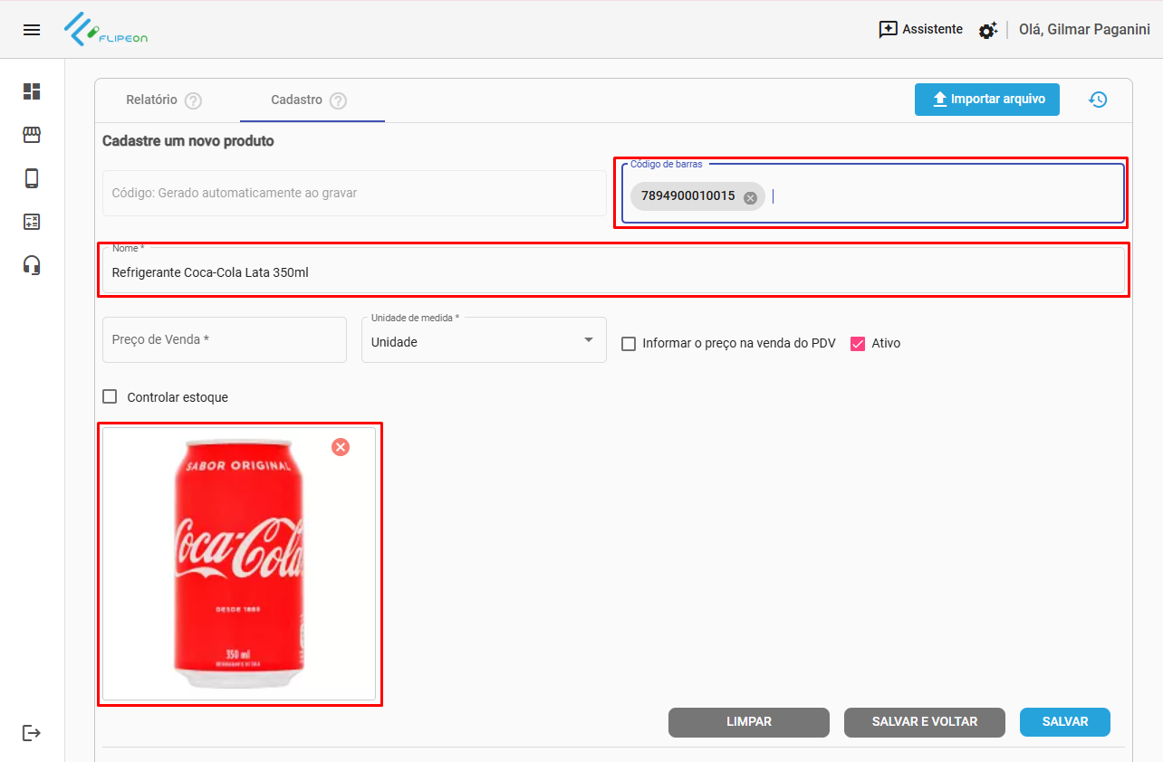 Caso o código de produtos exista em nossa base de dados, será sugerido o nome do produto e incluída a imagem do produto automaticamente.