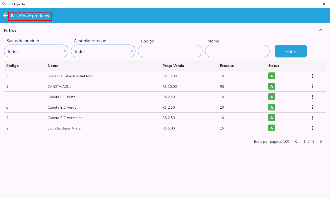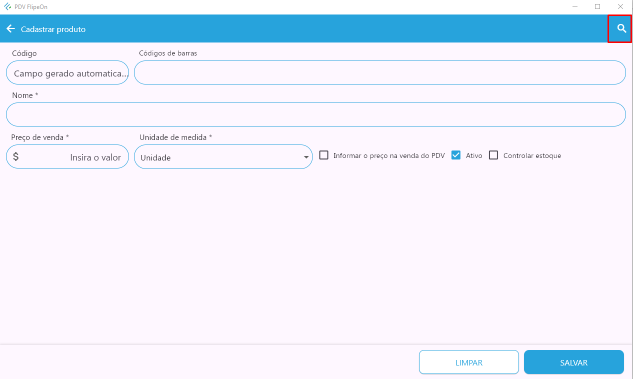 Para acessar o relatório dos produtos cadastrados, clique na lupa no canto da tela.