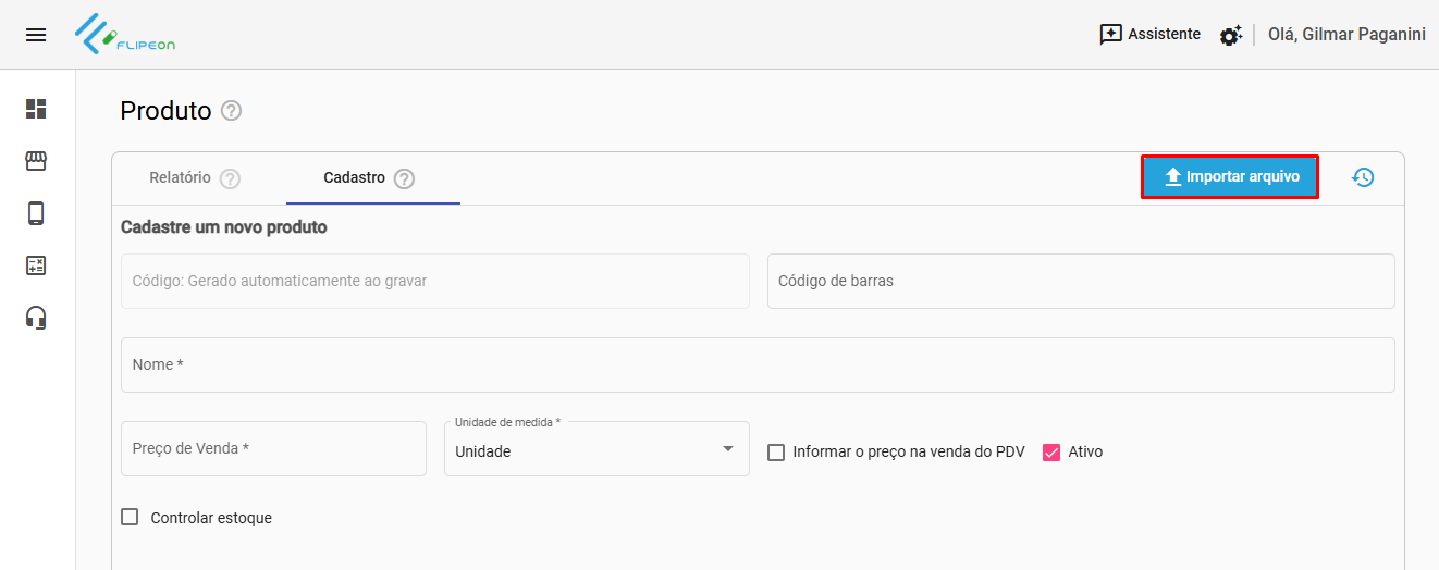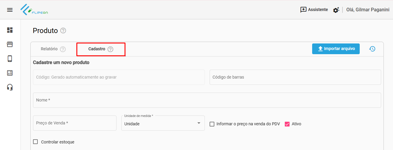 - Obrigatório: Código, Nome, Unidade de Medida, Preço, CFOP, CSOSN, PIS, COFINS, NCM, CEST