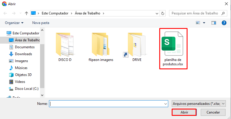 - Selecione o arquivo Excel(.xlsx) ou CSV(.csv).