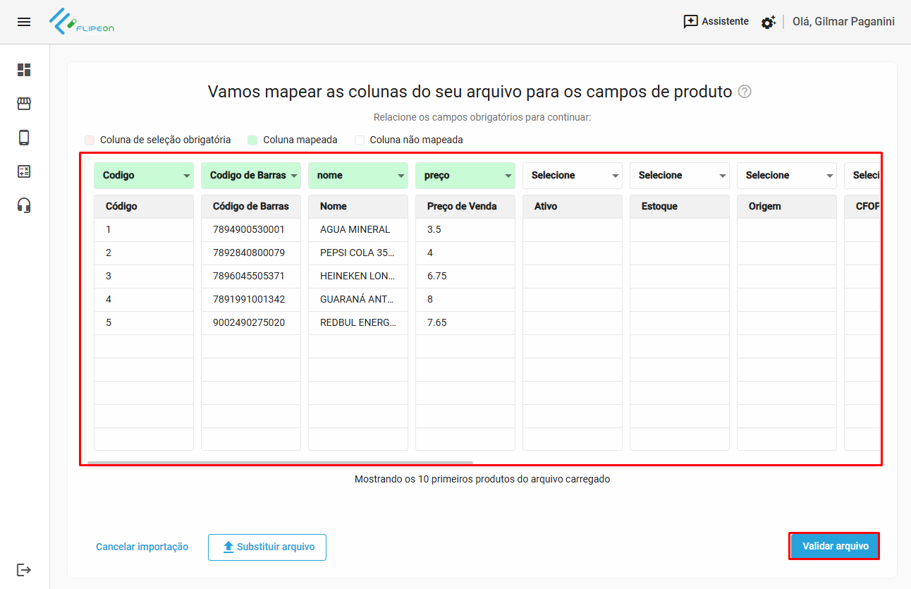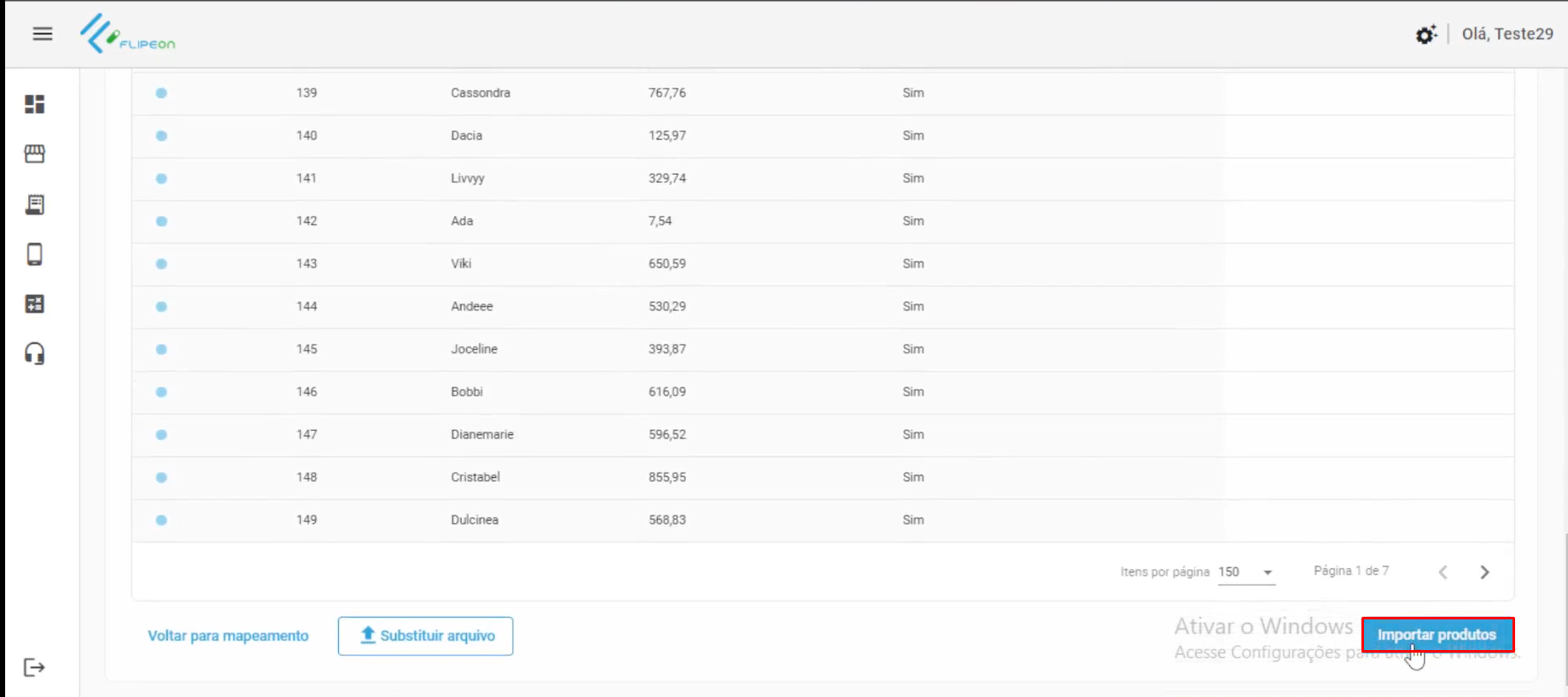 O FlipeOn irá ler e carregar a planilha exibindo os produtos contidos nela.