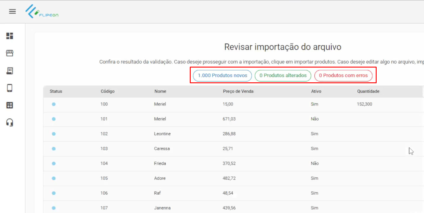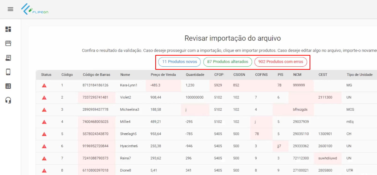 - Na tela de validação serão apresentados os produtos novos, alterados e com erro.