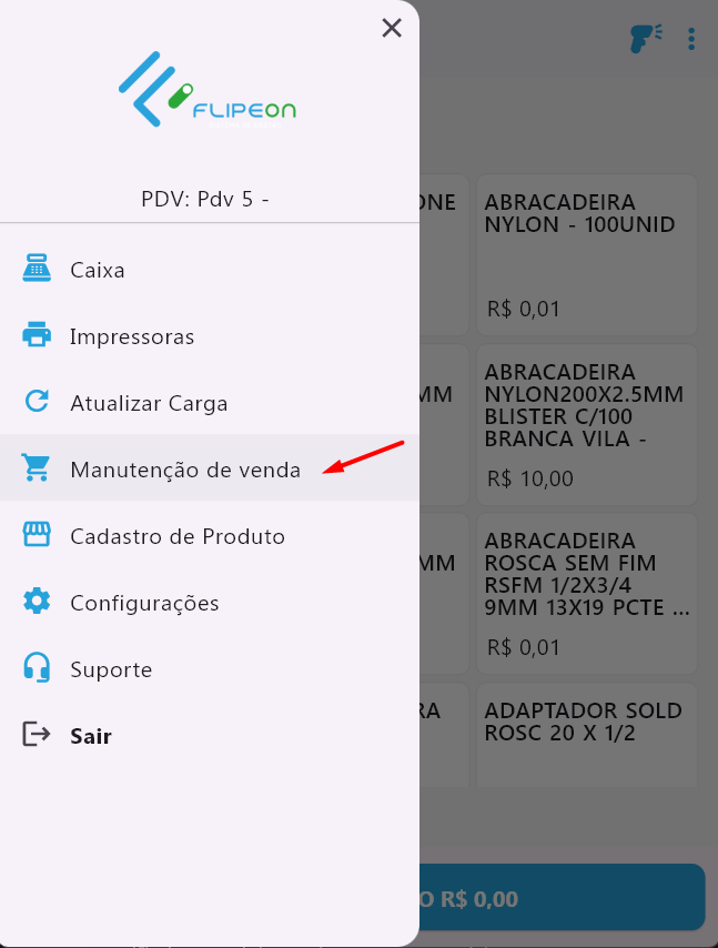 - Abra o menu de telas e acesse Manutenção de venda
