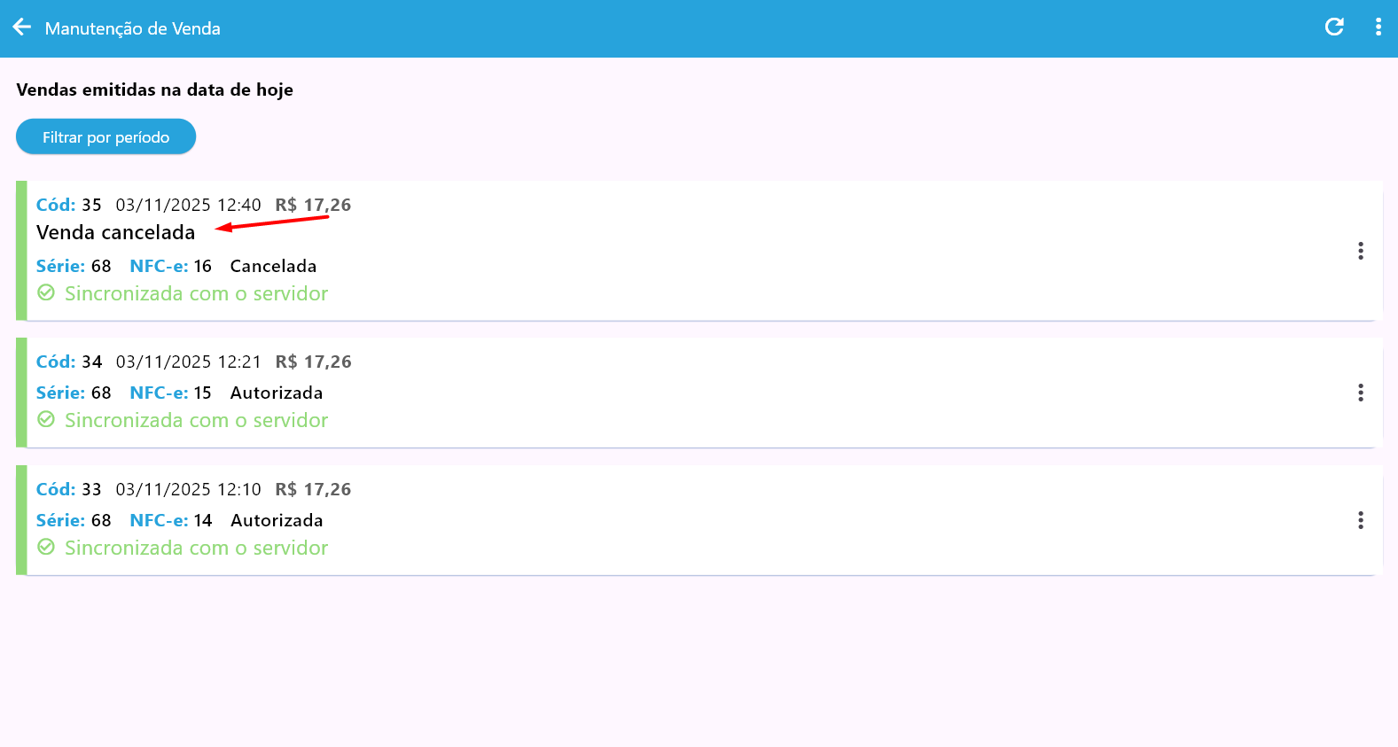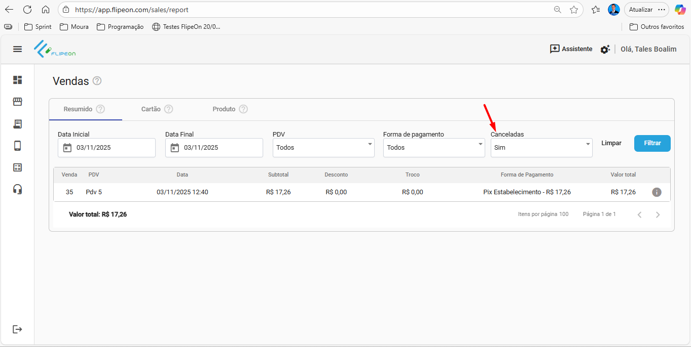 Para saber as vendas canceladas, acesse o Relatório de venda no Administrativo filtrando por Canceladas