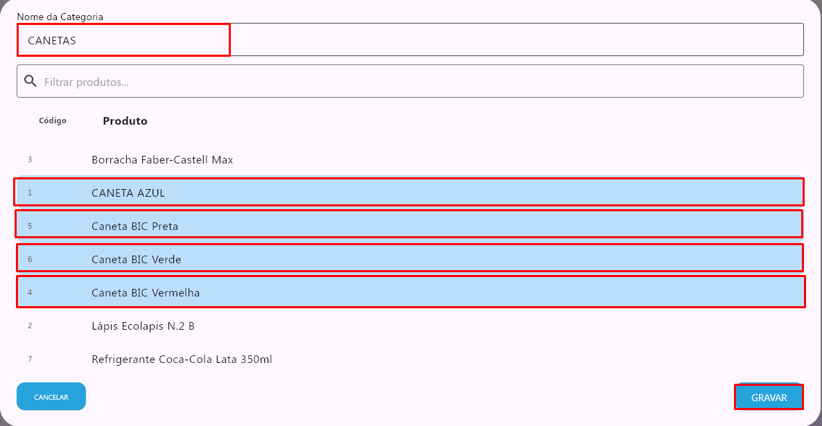 - Informe o nome da categoria, selecione os produtos que farão parte dela e clique em Gravar.