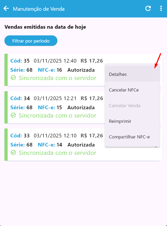 - Para mais informações da venda, pressione nos três pontos e pressione Detalhes