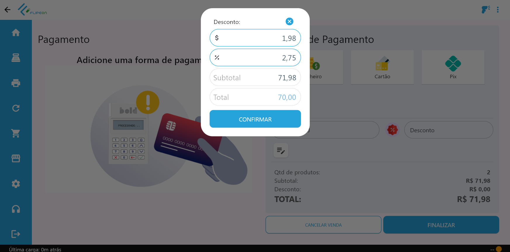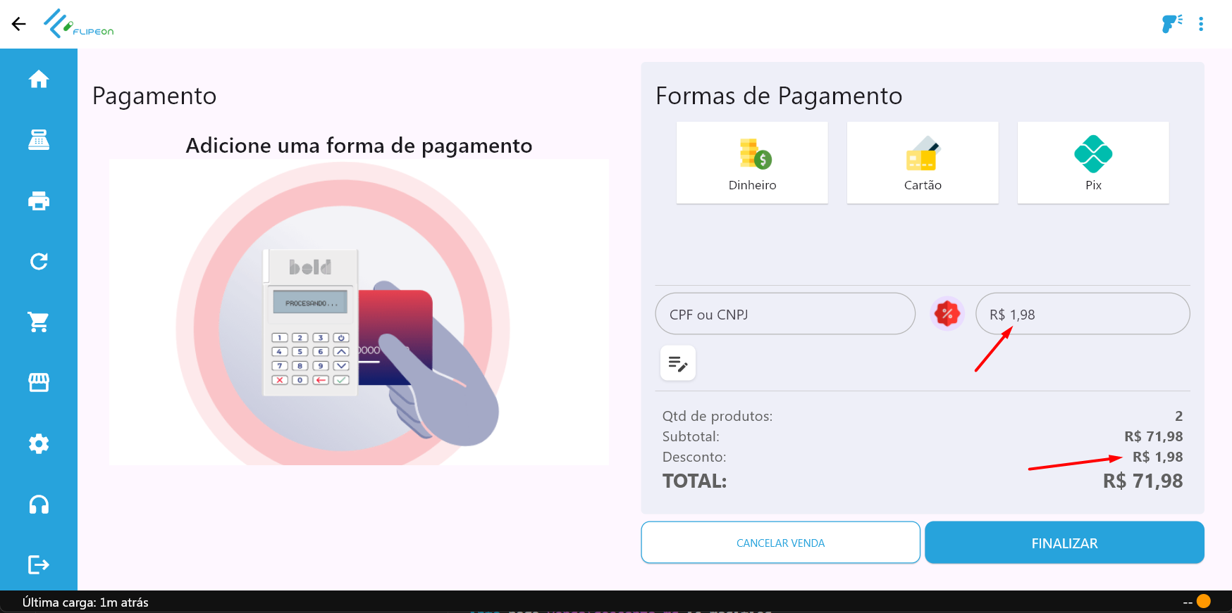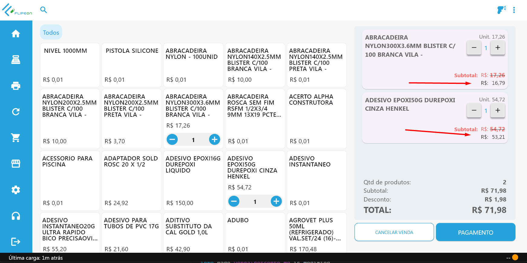 - O desconto é incluído como rateio em cada produto adicionado na venda