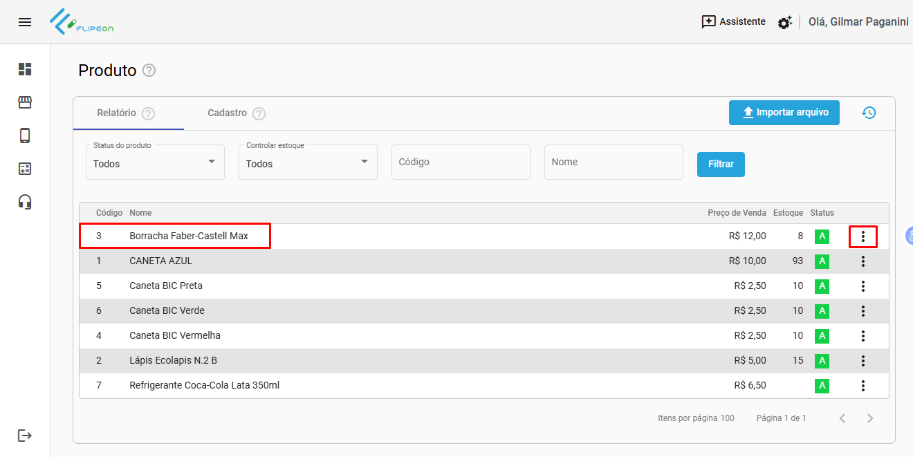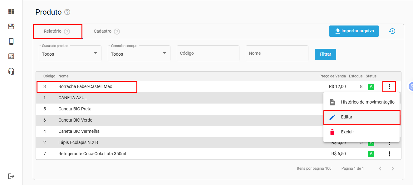 Na aba Relatório escolha o produto que será devolvido e clique no botão 3 pontinhos (...) no final da linha.