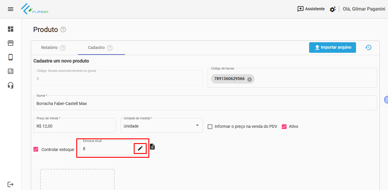 No campo Estoque Atual, clique no lápis para editar.
