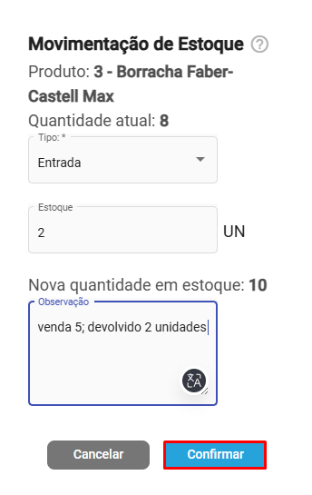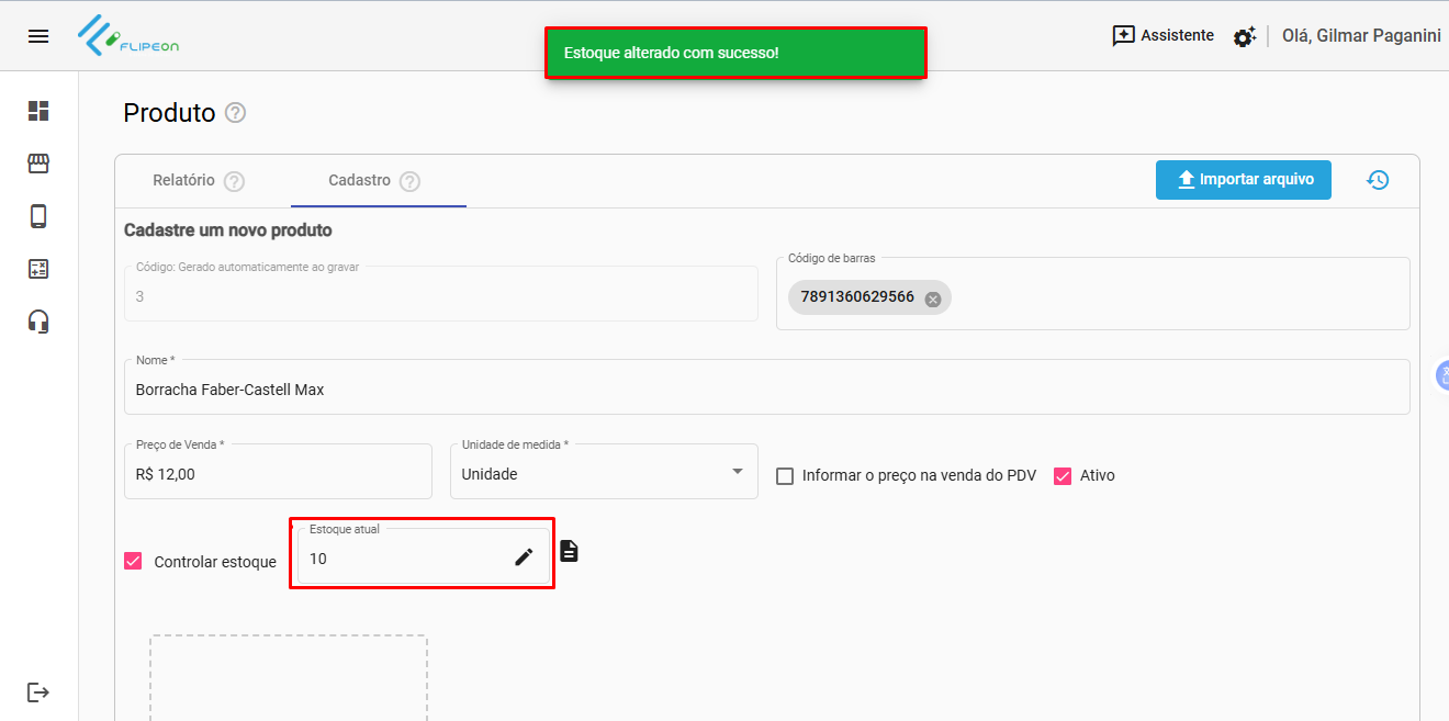 A quantidade será alterada e será exibido o estoque atual na tela de cadastro do produto.